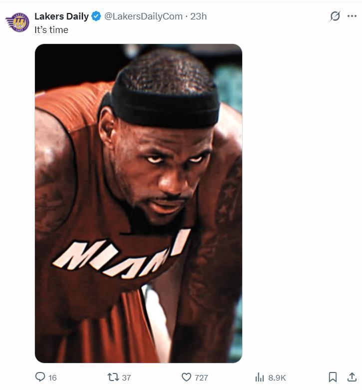 湖媒Lakers Daily曬出詹姆斯死亡之瞳的經典一幕寫道:是時候了。