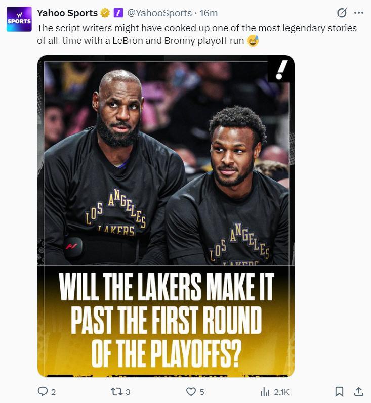 《雅虎體育》還調侃:這些NBA的編劇們創作出了有史以來最傳奇的故事之一,湖人季後賽包含了勒布朗與布朗尼的父子同臺。