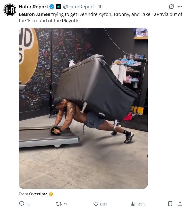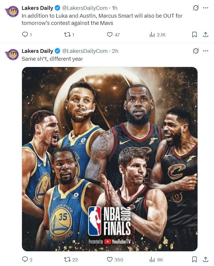 湖媒Lakers Daily又寫道:東契奇、裏夫斯、斯瑪特缺席對陣獨行俠,詹姆斯的季後賽似乎又變成了2018年單核對上宇宙勇!