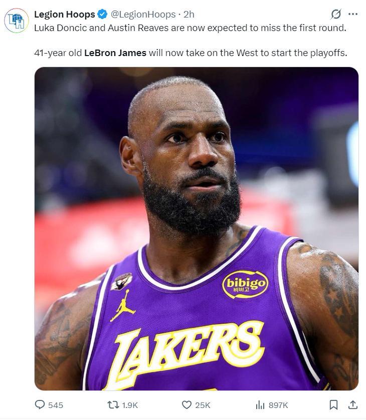 美媒LH寫道:東契奇與裏夫斯預計將缺席季後賽首輪,41歲的勒布朗將單核帶隊征戰季後賽。