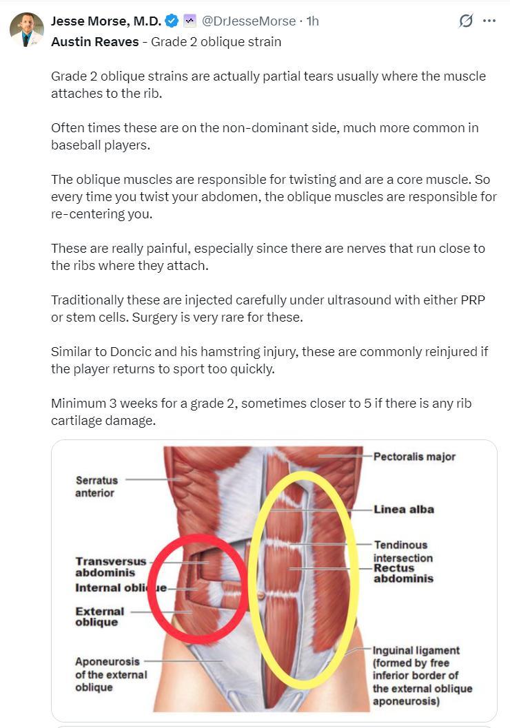 醫學專家Jesse More詳細的分解了裏夫斯的傷情:腹斜肌二級拉傷,這種腹斜肌的拉傷是屬於部分撕裂,這種情況通常發生在肌肉與肋骨的連接處,這種情況多出現在非主導的一側,更多會出現在棒球運動員身上。