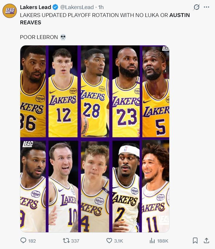 湖媒曬出了湖人隊季後賽的潛在輪換:先發斯瑪特、拉拉維亞、八村壘、詹姆斯、艾頓,替補布朗尼、肯納德、克內克特、範德比爾特、海斯。