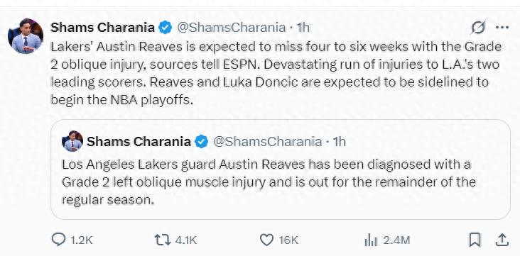 北京時間4月5日,根據ESPN名記Shams的報道,湖人隊的後衛奧斯汀-裏夫斯因爲左側腹斜肌二級損傷,預計將缺席4-6周常規賽報銷。湖人的兩位頭號得分手接連遭遇傷病令人沮喪,裏夫斯與東契奇都預計在季後賽開局階段缺席。