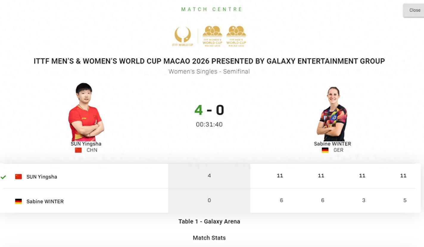 北京時間4月5日,2026年澳門世界盃女單半決賽G1,孫穎莎4-0橫掃溫特晉級決賽,四局比分:【11-6,11-6,11-3,11-5】。也就是說四局比賽溫特合計只拿到20分,這就是世界第一的恐怖統治力嗎?孫穎莎已經連續三屆澳門世界盃進入決賽。