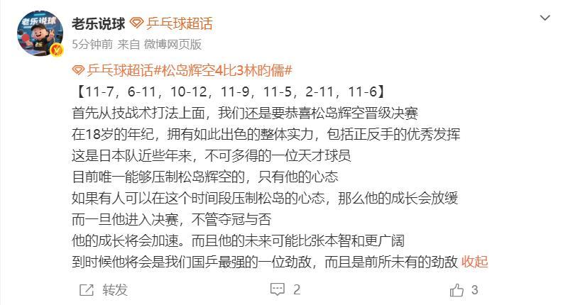 博主談到18歲的松島輝空這樣評價:從技戰術打法上面,18歲的松島輝空整體實力非常出色,正反手都很優秀,他是日乒近來不可多得的真正天才球員。目前唯一能壓制松島的只有他的心態,如果這個時間段有人可以壓制他的心態那麼他的成長會放緩。