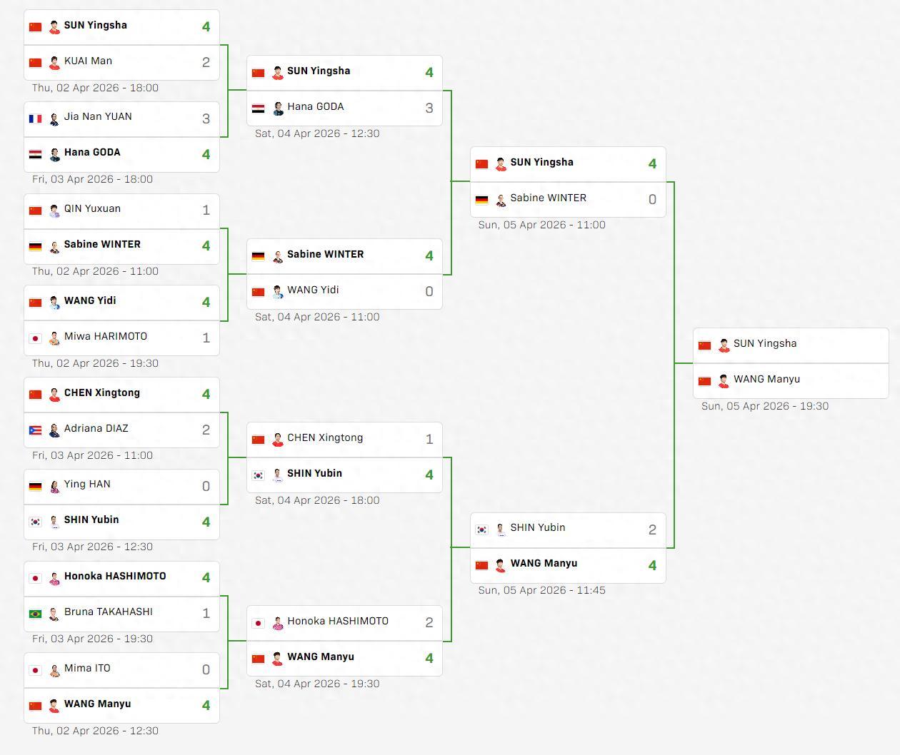 在孫穎莎4-0橫掃溫特後,她在接受採訪時談到決賽的展望:對於決賽來說,我覺得自己有更多的時間去恢復去準備,但當然我也相信曼昱能夠贏下接下來的比賽,自己還是希望能夠跟曼昱順利會師到決賽,給大家奉獻一場精彩的比賽。