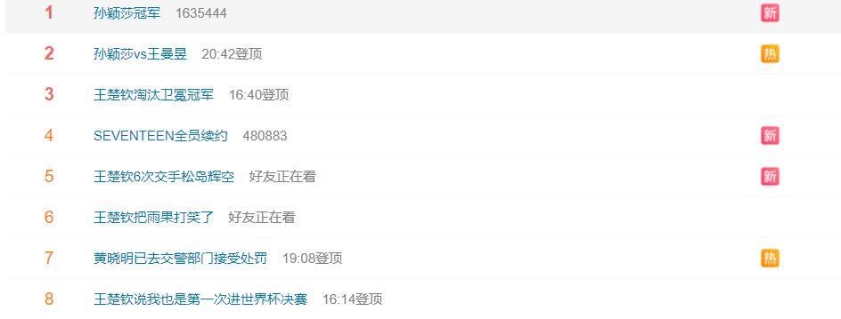 孫穎莎冠軍也登上了熱搜第一的位置,孫穎莎賽後的發言也非常謙遜,她甚至還盛讚了18歲的漢娜-高達,她表示自己就差一點就被漢娜-高達給淘汰了。