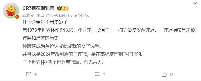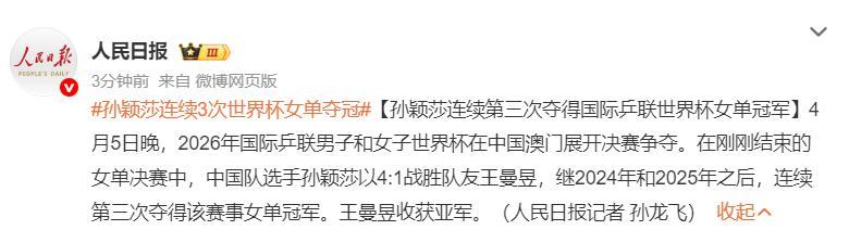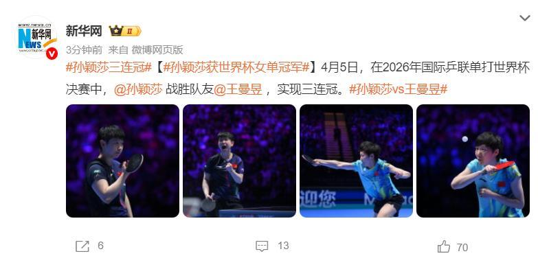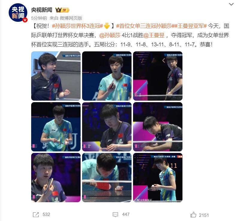 多家央視媒體紛紛爲孫穎莎打Call,她成爲首位女單世界盃三連冠的選手。
