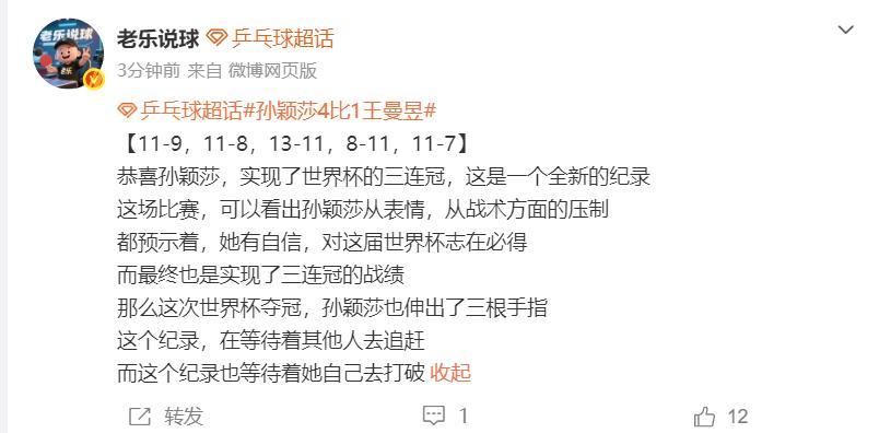 博主賽後也盛讚了孫穎莎,這場比賽從孫穎莎的表情、技戰術的壓制看出她的自信,對這屆世界盃志在必得,她最終也實現了三連冠的壯舉,這個紀錄未來會等待其他人去追趕,而這個紀錄她未來也有希望繼續打破(四連冠)。