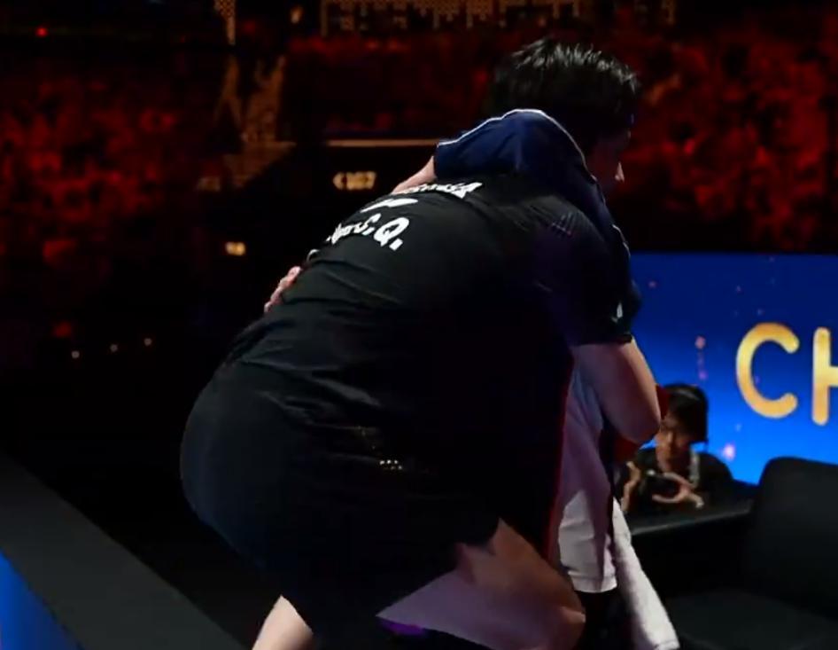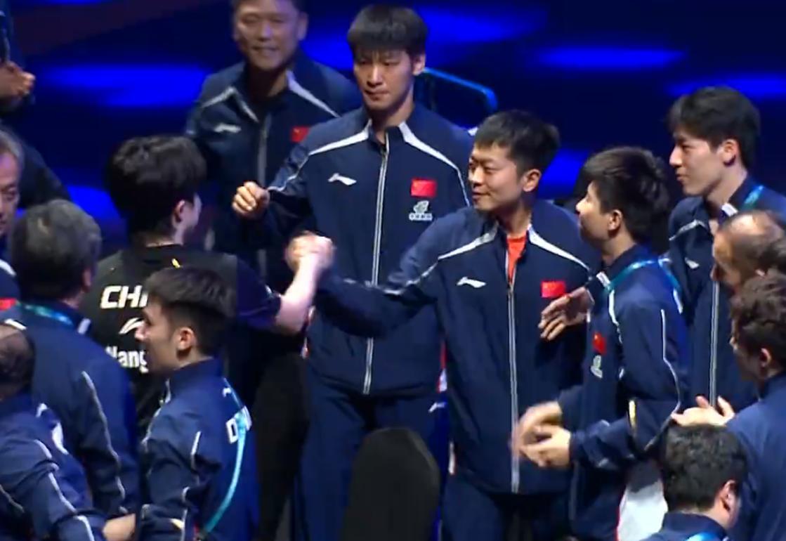 王楚欽走到國乒替補席後第一時間跟王勵勤擁抱,隨後跟多位國乒小將握手,陳垣宇、袁勵岑、溫瑞博等等,這也算是國乒的一種傳承。
