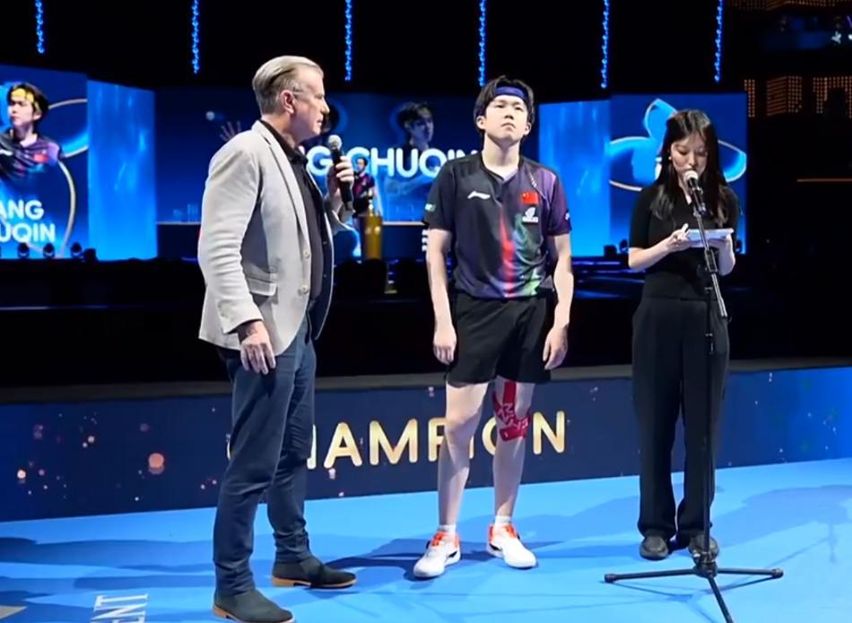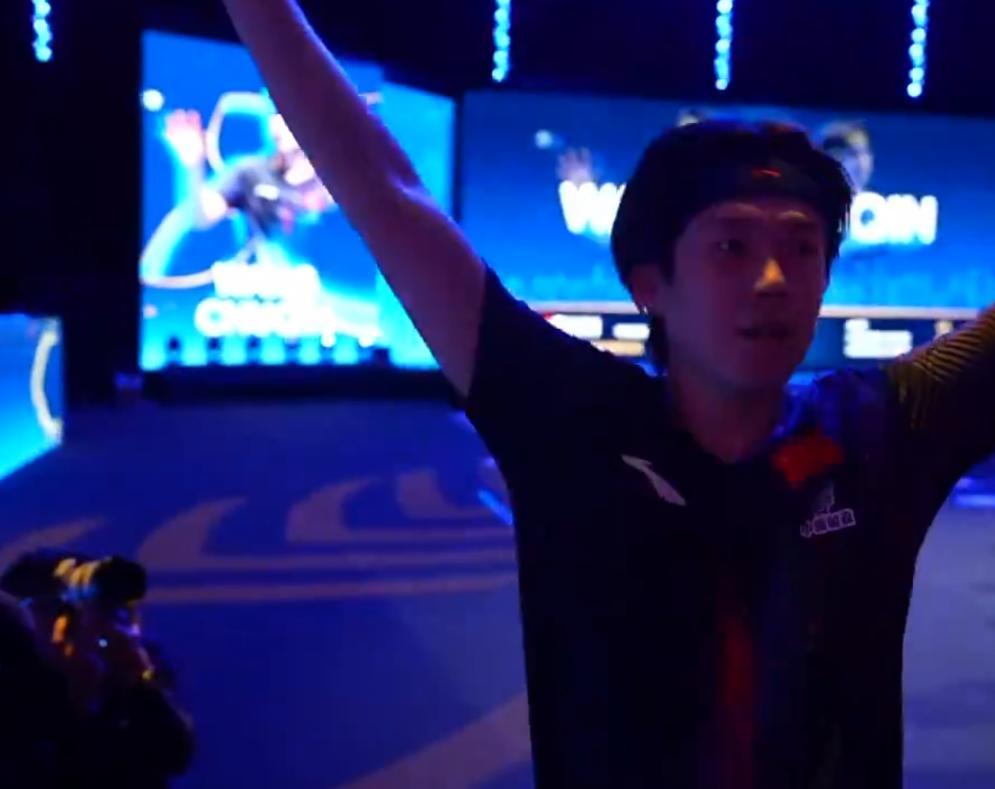 王楚欽在跟對手握手後,全場的球迷高呼‘王楚欽冠軍’、‘王楚欽你最棒’,王楚欽張開雙臂接受球迷的歡呼,隨後王楚欽還朝着看臺的球迷鞠躬致謝。