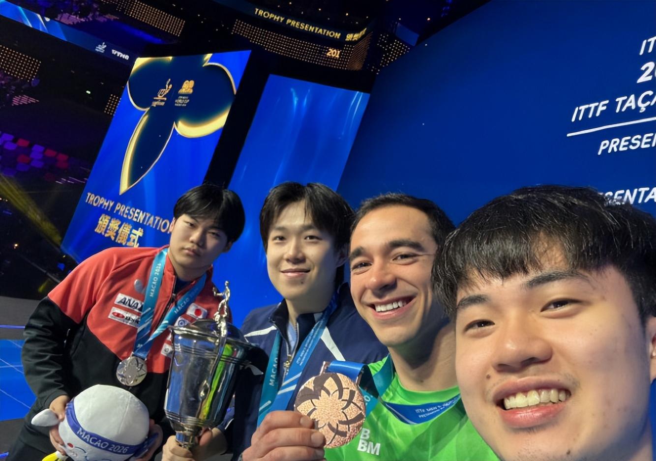 四位站在領獎臺的男單選手(松島輝空、王楚欽、雨果、林昀儒)場邊合影,這是林昀儒的手持角度,除了松島輝空外的三人都露出了燦爛的笑容,只有18歲的松島輝空根本笑不出來。