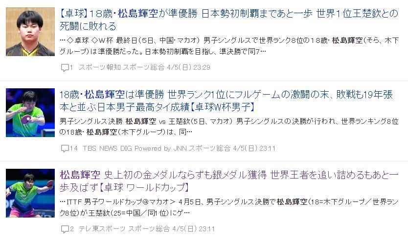 日媒《TBS》則寫道:18歲的松島輝空世界盃亞軍已經追平2019年張本智和日本男乒的最佳成績,松島輝空的天賦已經得到認可。