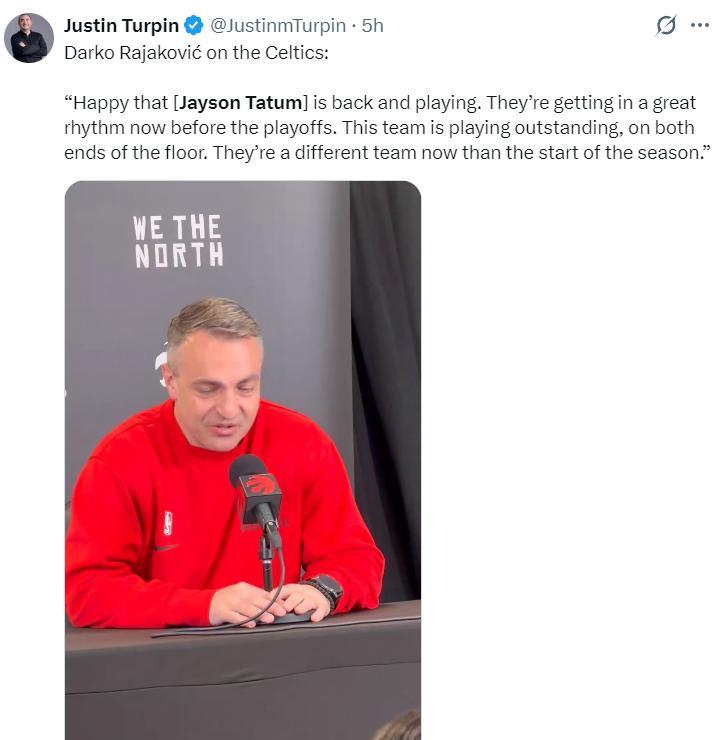 就連猛龍主帥拉賈科維奇談到這支綠凱時都讚不絕口:很高興塔圖姆迴歸了。在季後賽來臨前他們已經進入一個很好的狀態,這支球隊非常出色,無論是進攻還是防守都做得很好,與賽季初相比,這支球隊因爲塔圖姆的加入截然不同了。