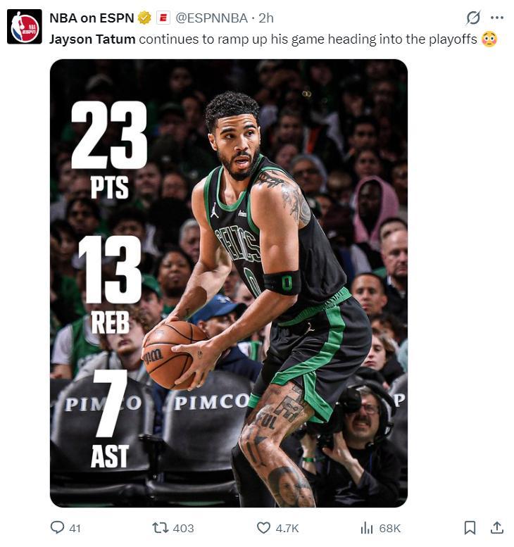 塔圖姆上一場拿到23+11+9,這一場拿到23+13+7,塔圖姆越來越全能,就連ESPN都說:塔圖姆在季後賽之前繼續提升自己的競技狀態。