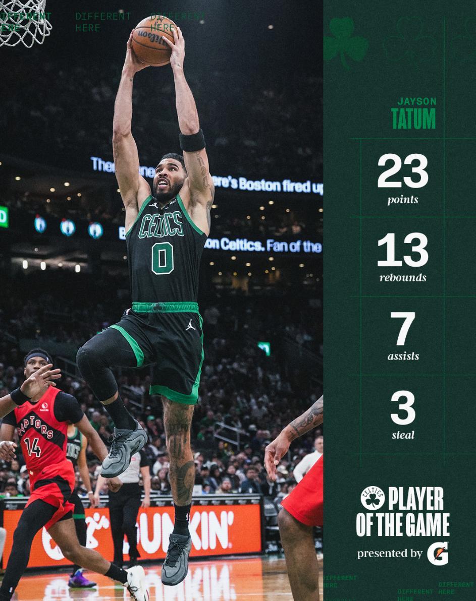 此役傑森-塔圖姆出戰34分鐘,15中7,三分6中2,罰球8中7,拿到23分13籃板7助攻3搶斷,命中率46.7%,三分命中率33.3%,真實命中率62.1%,正負值+13。