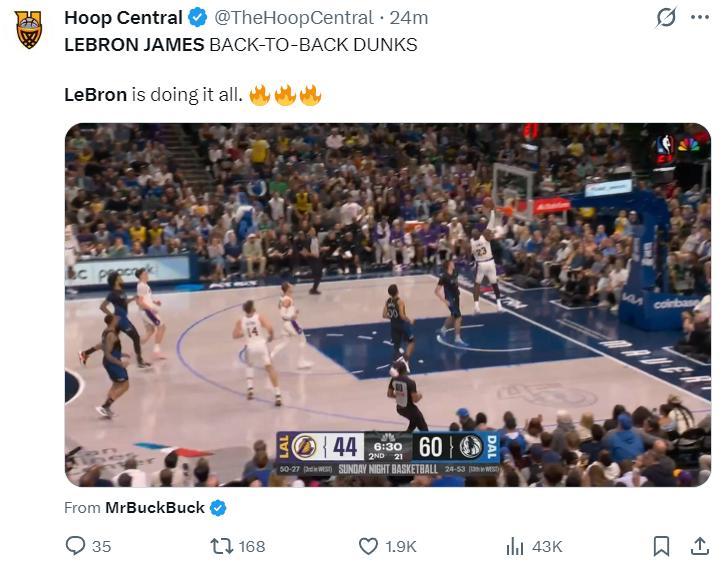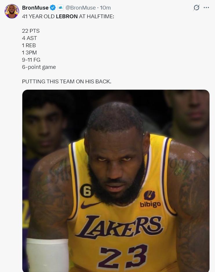 上半場41歲的勒布朗已經火力全開,11中9,三分1中1,拿到22分4助攻1籃板,湖媒盛讚死亡之瞳版本的勒布朗再度迴歸了。
