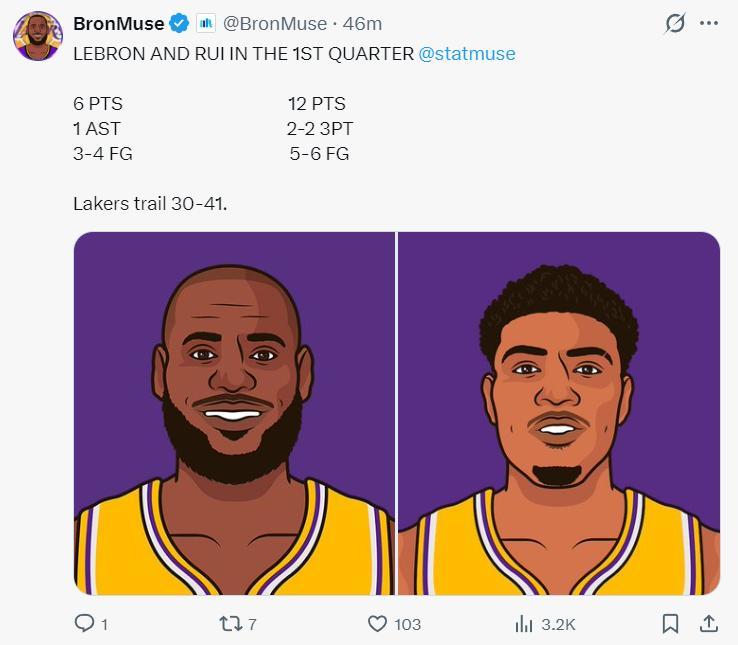 41歲的勒布朗首節8分鐘裏,4中3,拿到6分1籃板1助攻,八村壘首節6中5拿到12分,但湖人的問題是防守,獨行俠首節狂攬41分領先湖人11分之多。