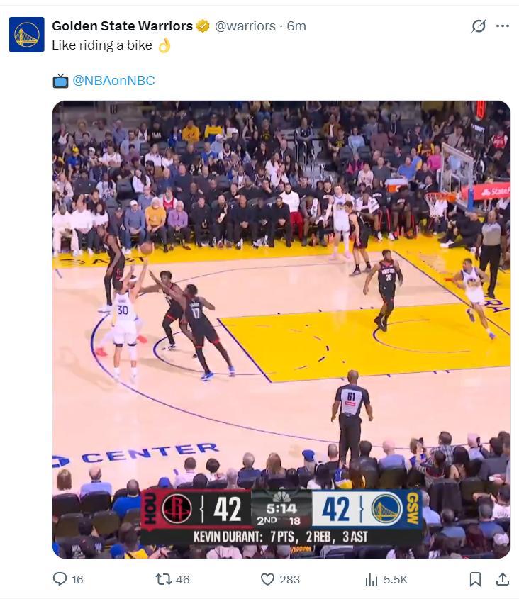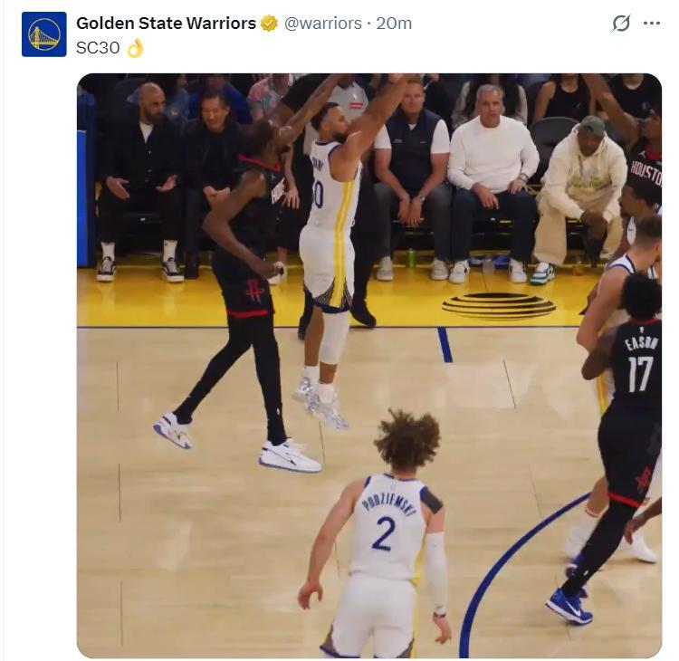 庫裏復出的第一球是一個45度的超遠三分,這個三分球是在杜蘭特協防下的,庫裏首節4中1+三分3中1拿到3分1助攻,他外線出手三次,禁區的一次出手是三不沾。