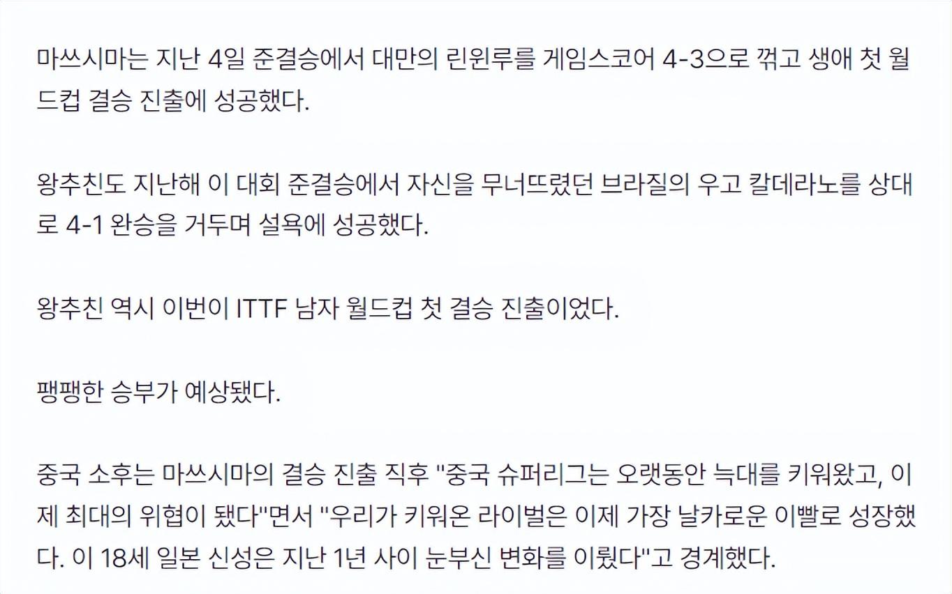 隨後文中寫道:松島輝空在半決賽4-3淘汰了林昀儒,此前他曾6連敗林昀儒,王楚欽在半決賽4-1復仇了去年半決賽淘汰自己的雨果-卡爾德拉諾。