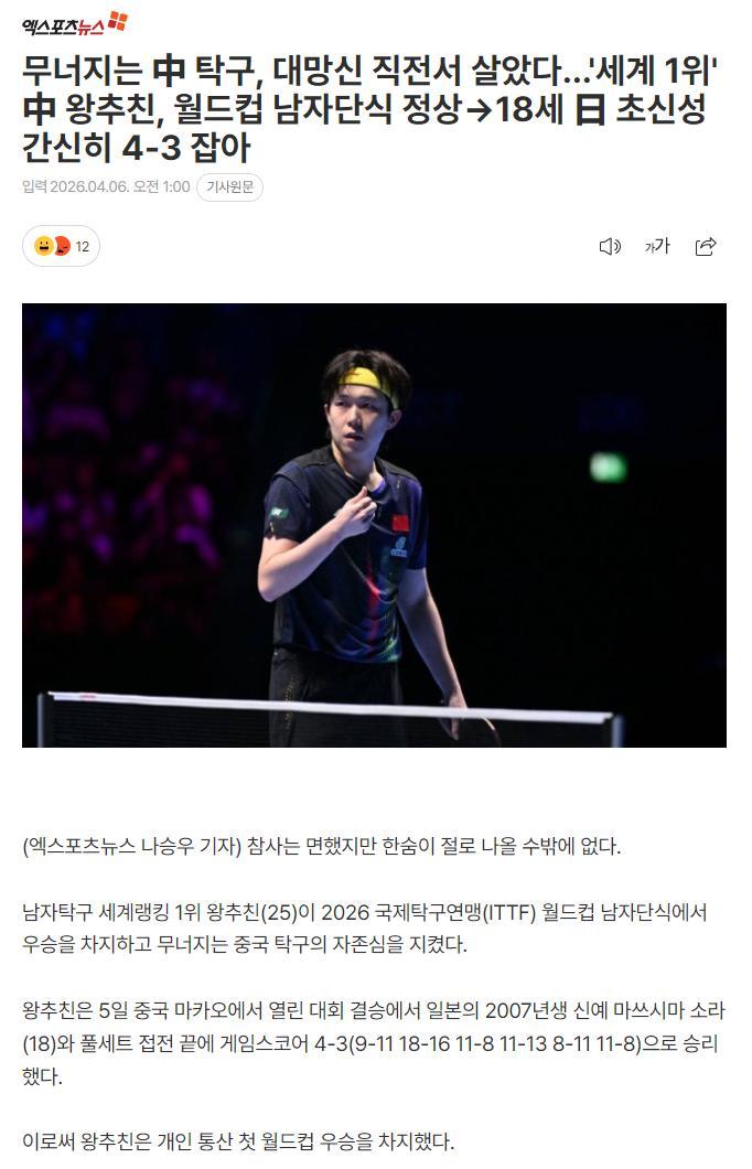 北京時間4月6日晚,韓國媒體《世博新聞》專門談到了‘養狼計劃’這個話題,他們寫道:世界排名第一的王楚欽獲得世界盃冠軍——但面對18歲的松島輝空非常艱難地4-3涉險過關。