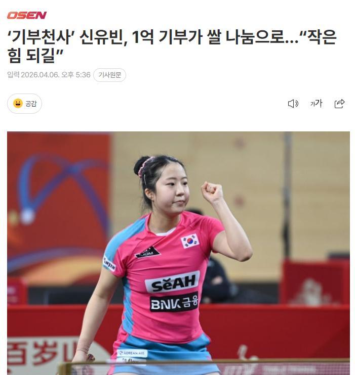 北京時間4月6日,根據韓媒《OSEN》的報道,申裕斌化身‘捐贈天使’,她向忠清南道唐津市捐贈了1億韓元,該捐款於本月3日通過唐津市往較爲偏遠的地區以大米的形式進行捐贈。