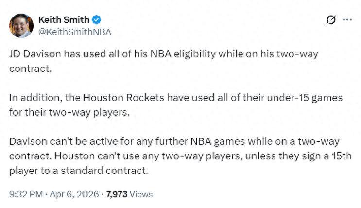 北京時間4月6日晚,根據NBA記者肯尼-史密斯的報道,JD-戴維森已經執行完了他雙向合同50場NBA常規賽的額度,火箭在激活的50場中只讓他打了27場,換言之戴維森已經無法爲火箭出戰任何的比賽,除非他們重新簽下一名標準合同球員。