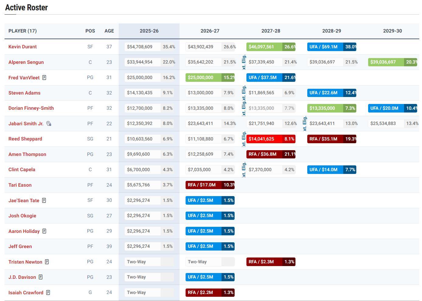 那麼將戴維森轉正後,火箭就會帶着15份全額保障合同進入季後賽:戴維森、杜蘭特、申京、範弗利特、亞當斯、芬尼史密斯、小賈、謝潑德、阿門、卡佩拉、伊森、泰特、奧科吉、霍勒迪、傑夫-格林。