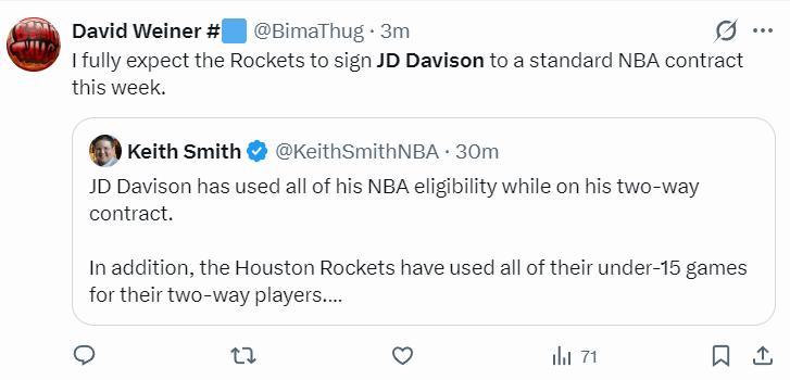 隨後火箭記者大衛-韋納轉推寫道:我堅信本週火箭隊就會將戴維森的雙向合同轉爲標準合同。