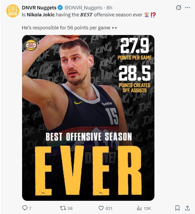 約基奇已經提前鎖定了場均三雙,他還有一項數據極爲恐怖,他場均27.9分,但通過助攻場均可以幫助球隊貢獻28.5分,換言之約基奇本賽季場均要造56.4分,掘金本賽季場均121.1分,約基奇一人創造的得分佔比全隊46.6%十分炸裂。