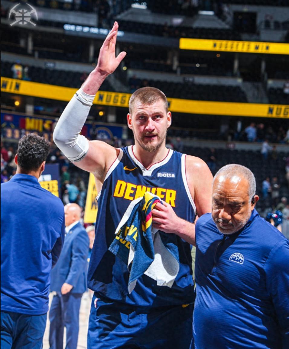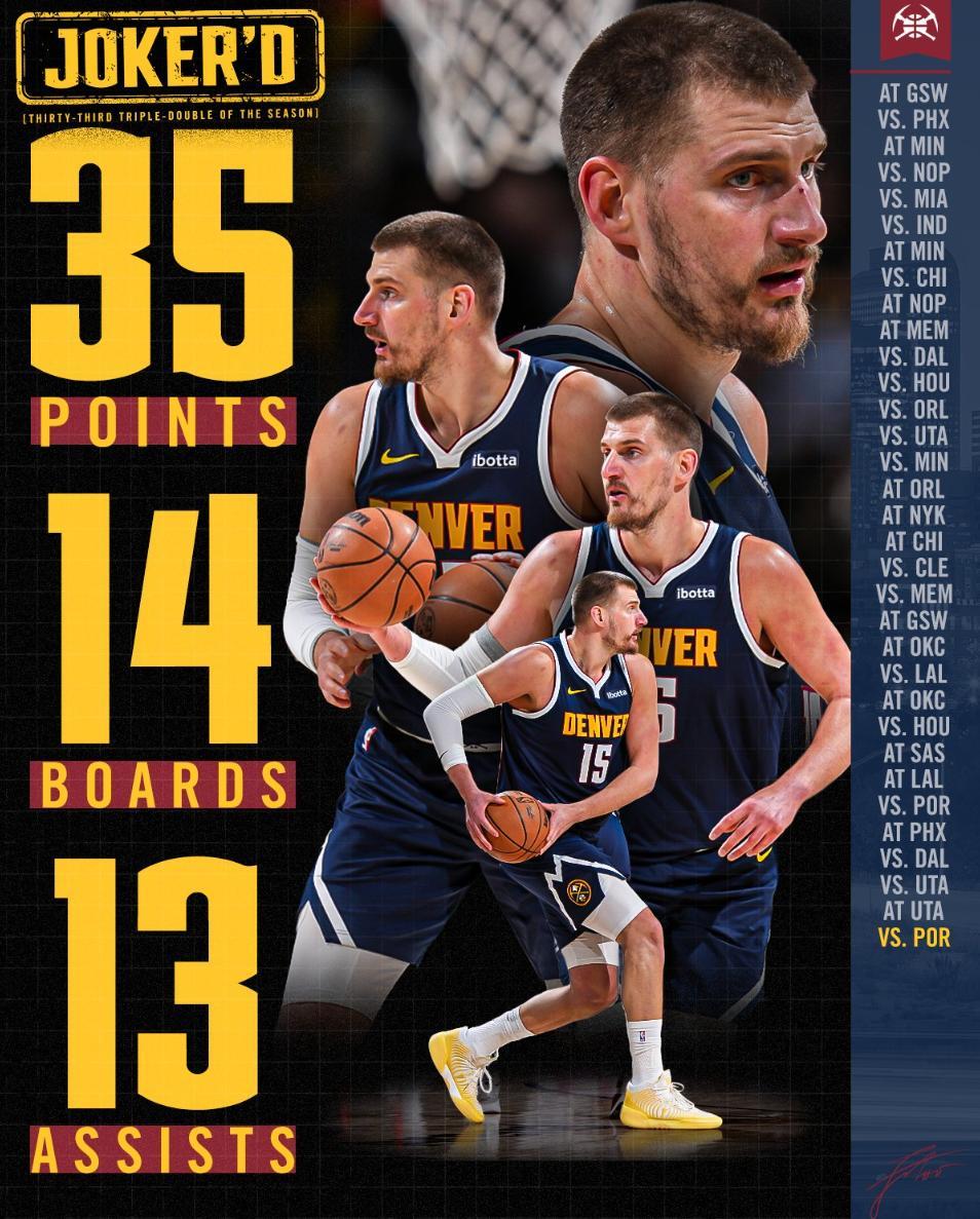 尼古拉-約基奇鏖戰43分鐘,31中15,三分5中1,罰球4中4,拿到35分14籃板13助攻5搶斷2蓋帽,命中率48.4%,三分命中率20%,這場比賽約基奇又創造多項紀錄。