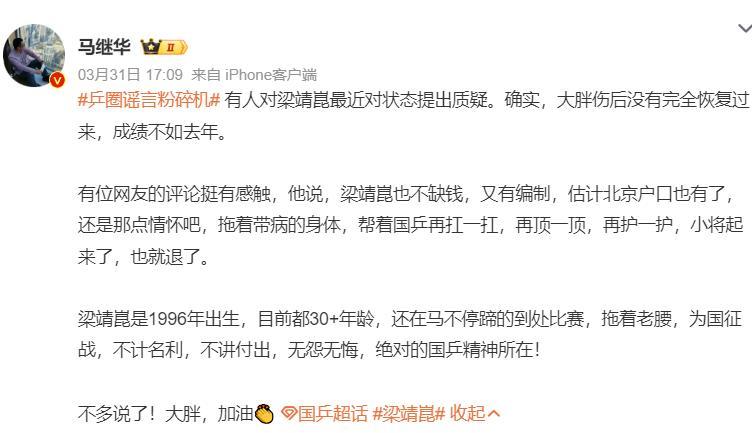 其實馬繼華此前就說過,梁靖崑的傷一直沒有痊癒,他成績不如去年,他也是一位30+的老將,拖着老腰到處爲國征戰不計名利,不講付出,無怨無悔,這絕對是國乒精神。