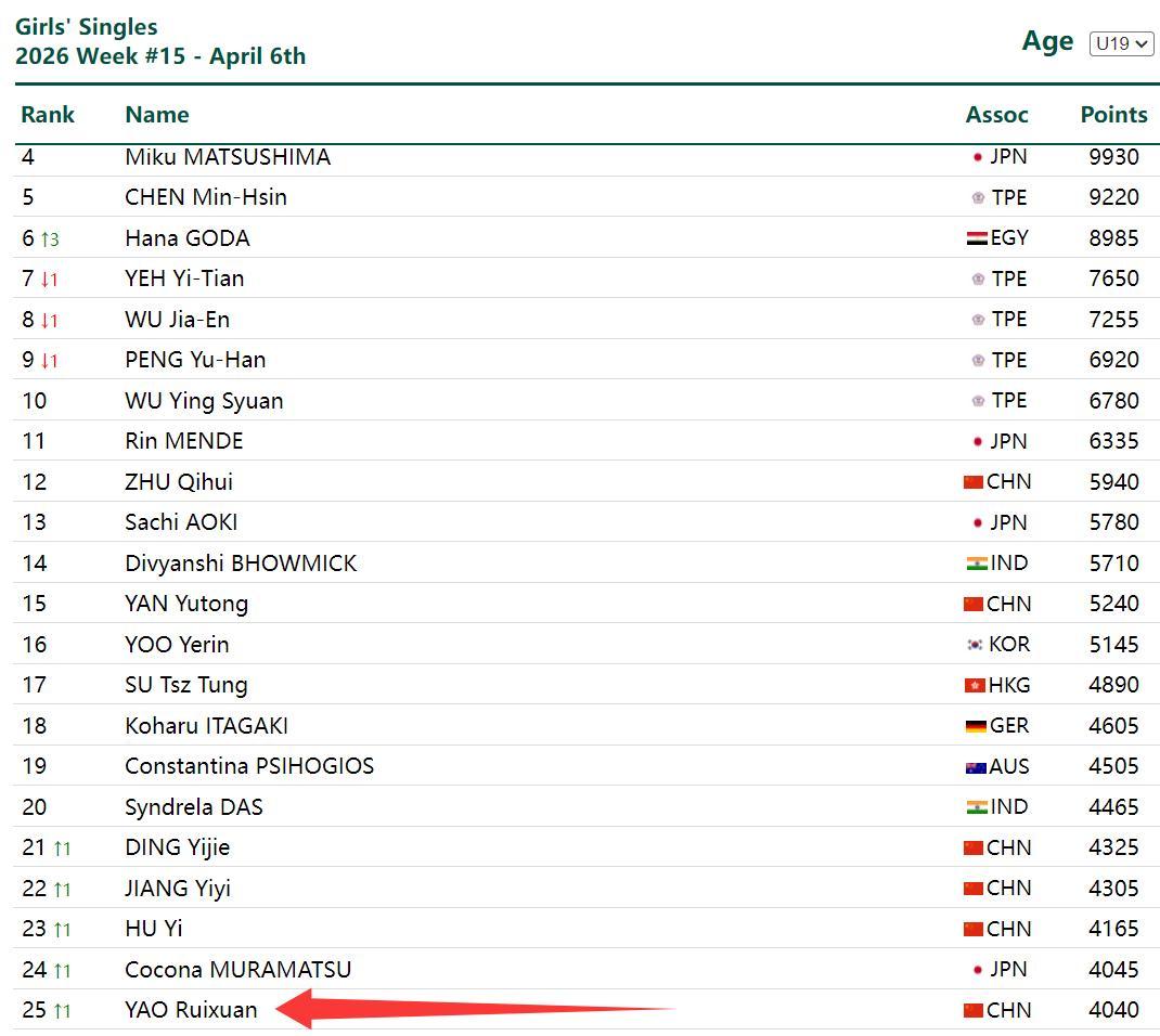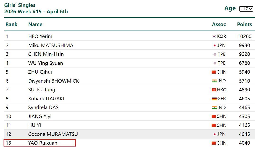 16歲的姚睿軒已經開始跨級鏖戰,目前她在U19的世界排名第25位。