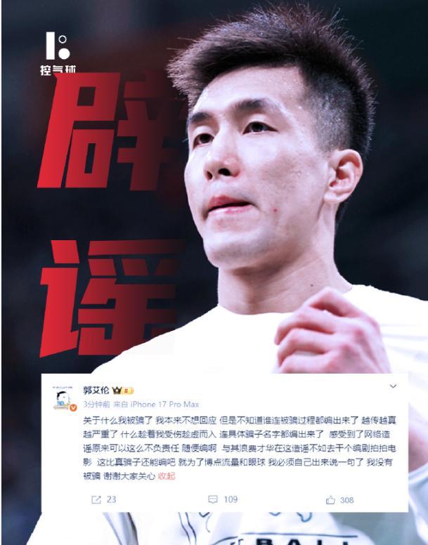 廣州受傷球員郭艾倫回應詐騙事件:他表示自己沒有被騙,都是外界編造的。