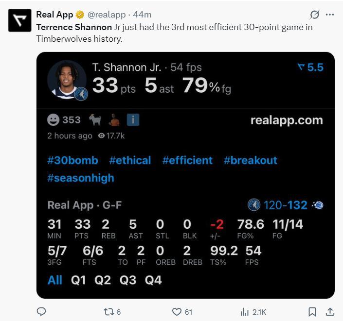 7.香農也是森林狼隊史效率第三高拿到30+的球員;