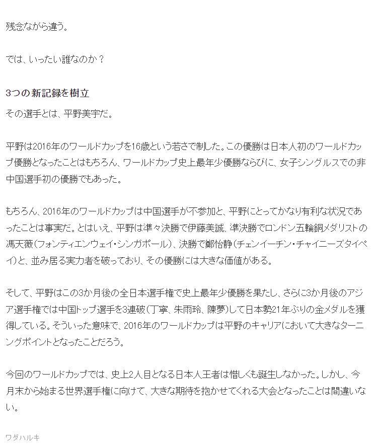 文中還寫道:2016年年僅16歲的平野美宇就拿到了世界盃冠軍,她也是世界盃歷史最年輕的冠軍,她也成爲非中國隊首位世界盃女子單打冠軍。