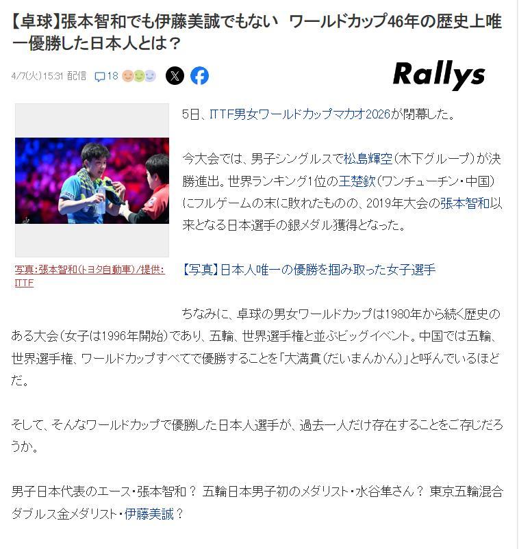 日媒《Rallys》撰文:不是張本智和,不是伊藤美誠,日乒自世界盃設立46年來唯一取得單打冠軍的人是平野美宇。