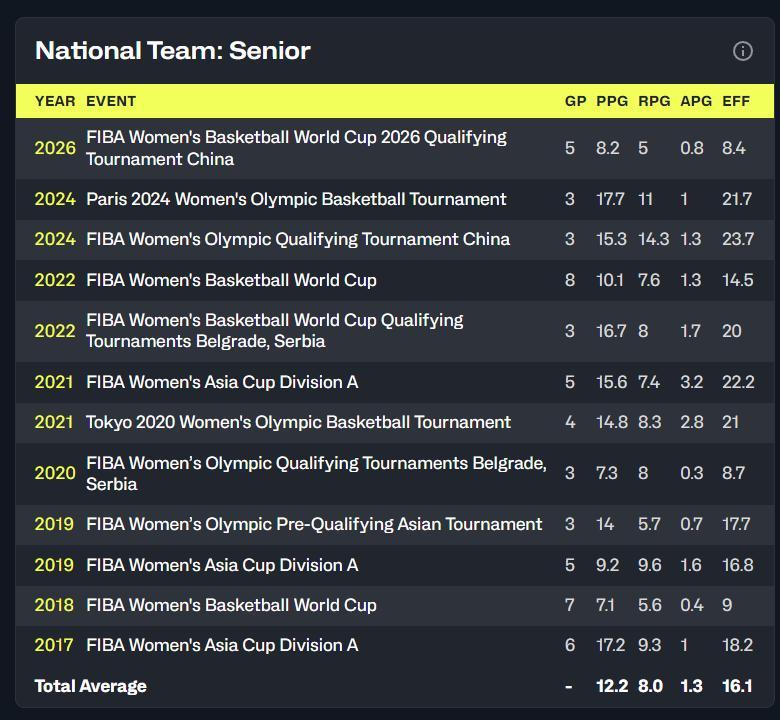 她剛剛在世預賽上幫助中國女籃拿到了直通德國世界盃的門票,五場比賽李月汝8.2分5籃板0.8助攻,命中率37%,首戰拿到21+10的數據,而後的四場比賽她的表現有所下滑,因爲宮魯鳴指導給了陳明伶、張子宇更多的鍛鍊機會。