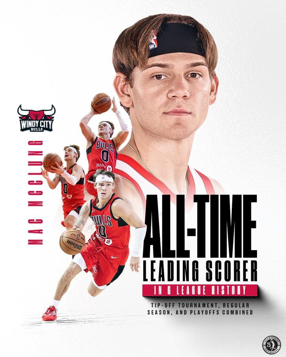 本賽季的麥克朗在G聯賽帶隊風城公牛打球,他場均31.8分7.9助攻3.6籃板,命中率51.5%,三分命中率38.1%,這已經是他生涯第二次拿到G聯賽的MVP,在2023-24賽季他也是MVP,而且那個賽季他還拿到了G聯賽的總冠軍。