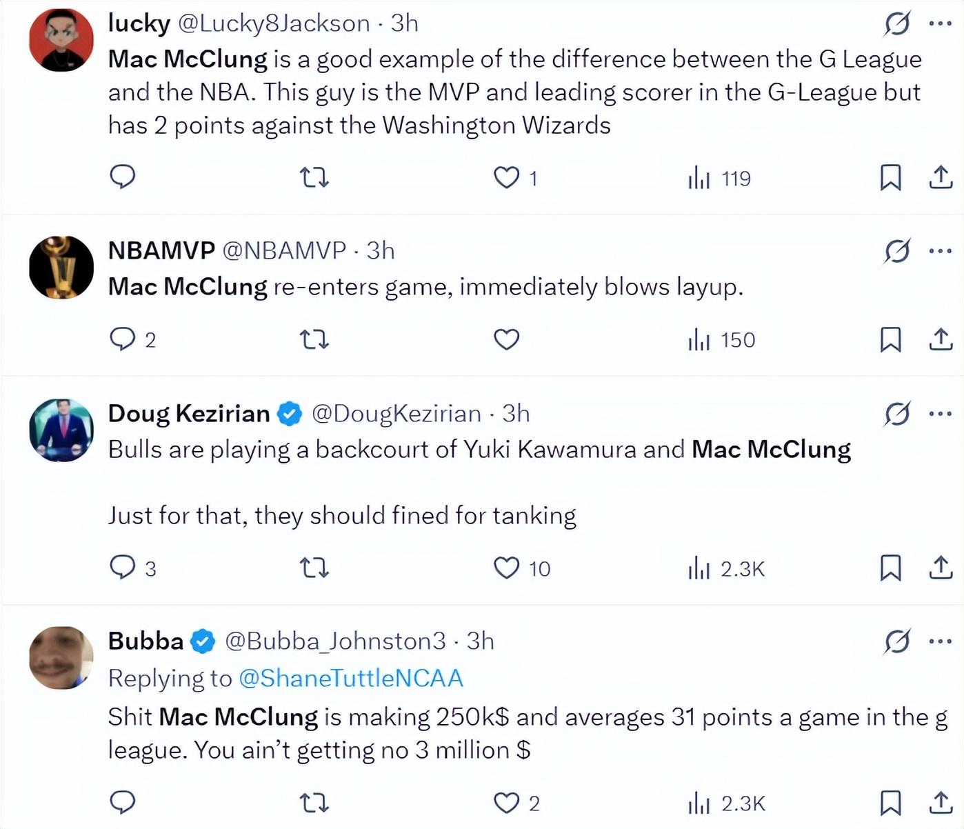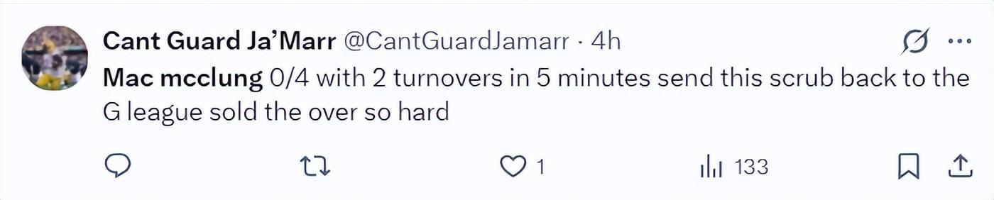 1.麥克朗登場5分鐘2失誤,還是把他送回G聯賽吧,讓他留在這裏打球太虧了。