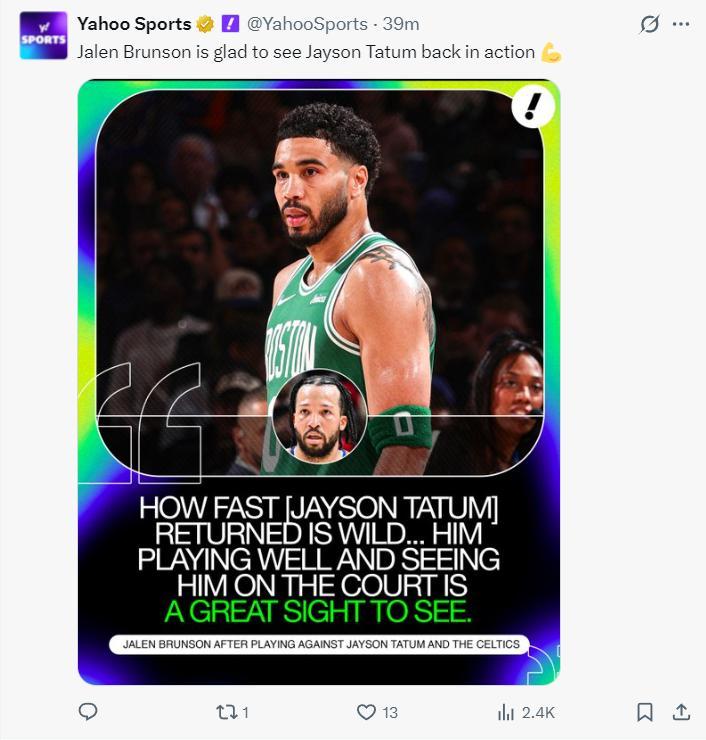 賽後布倫森的盛讚就算是唯一的安慰了,布倫森談到塔圖姆的復出:塔圖姆恢復得這麼快太不可思議了…… 看到他復出且打得這麼好,真的太棒了。【這是塔圖姆復出以來綠凱的第三場失利,實際上已經不算差】
