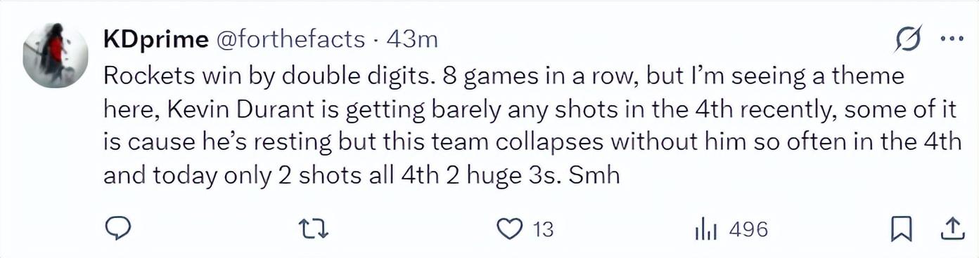 休媒:火箭已經連贏八場比賽,但我們看到一個趨勢,杜蘭特第四節幾乎沒有投籃機會大部分時間在休息,但這場球不同火箭崩盤後杜蘭特獲得兩次投籃機會全部都是關鍵三分。