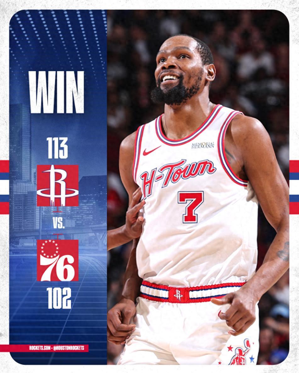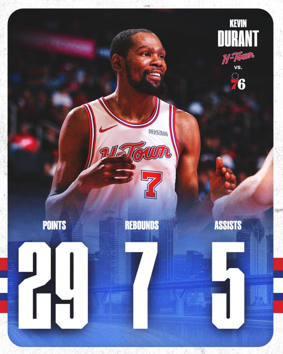 凱文-杜蘭特要三節打卡真的很難,在第三節杜蘭特下場時火箭還領先費城23分之多 ,都以爲他要三節打卡了,結果火箭在末節被費城打了18-0,烏度卡三個暫停都未能遏制頹勢,最終還是依靠杜蘭特加班6分43秒的兩個三分球才鎖定勝局。