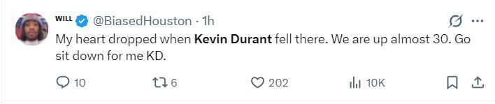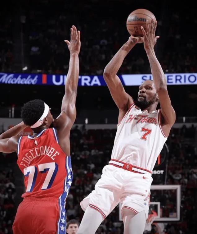 終場前4分41秒杜蘭特的三分球幫助火箭再度拉開到10分,終場前1分15秒杜蘭特的三分幫助火箭拉開到8分,這個三分球命中後費城已經無力迴天,杜蘭特也做了一個射箭的動作。