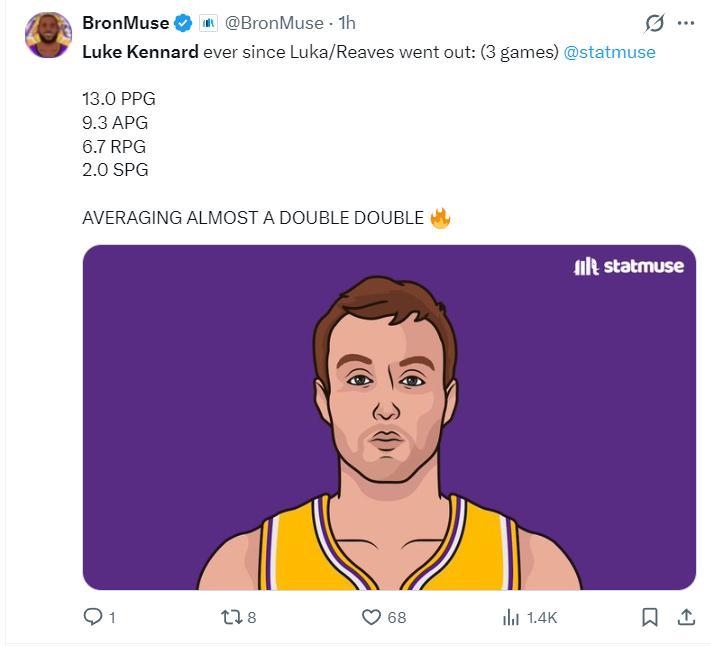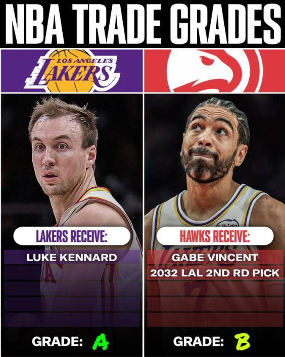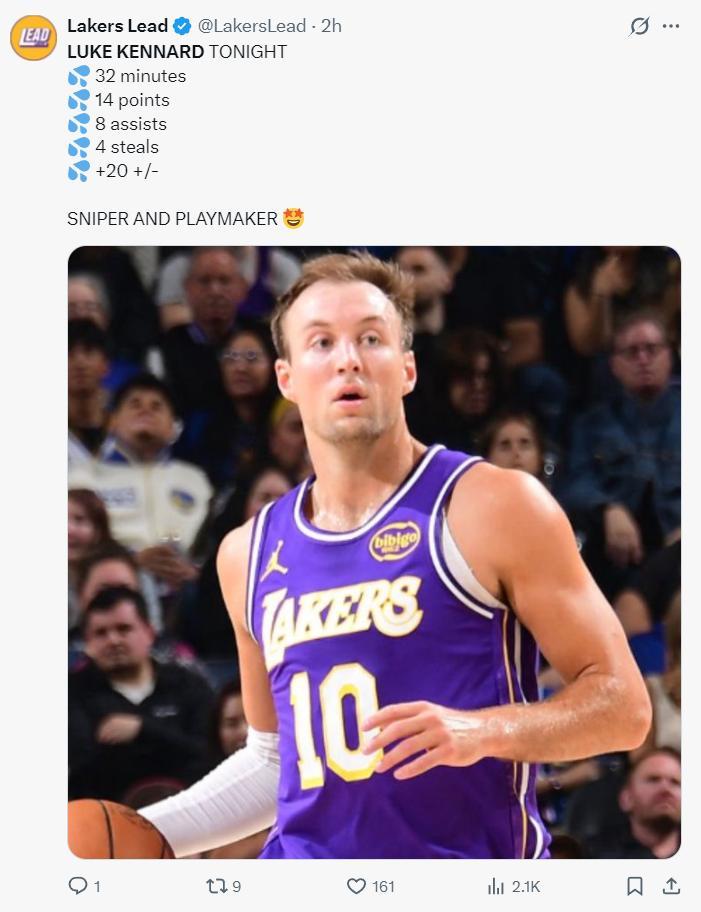 肯納德是湖人在交易截止日用文森特+1個2032年的湖人次輪籤從老鷹換來的,隨後交易評級湖人A,老鷹B,肯納德常年保持三分球命中率45%以上,他是湖人最需要的投手,但沒想到在東契奇、裏夫斯缺席的情況下他還能客串一號位。
