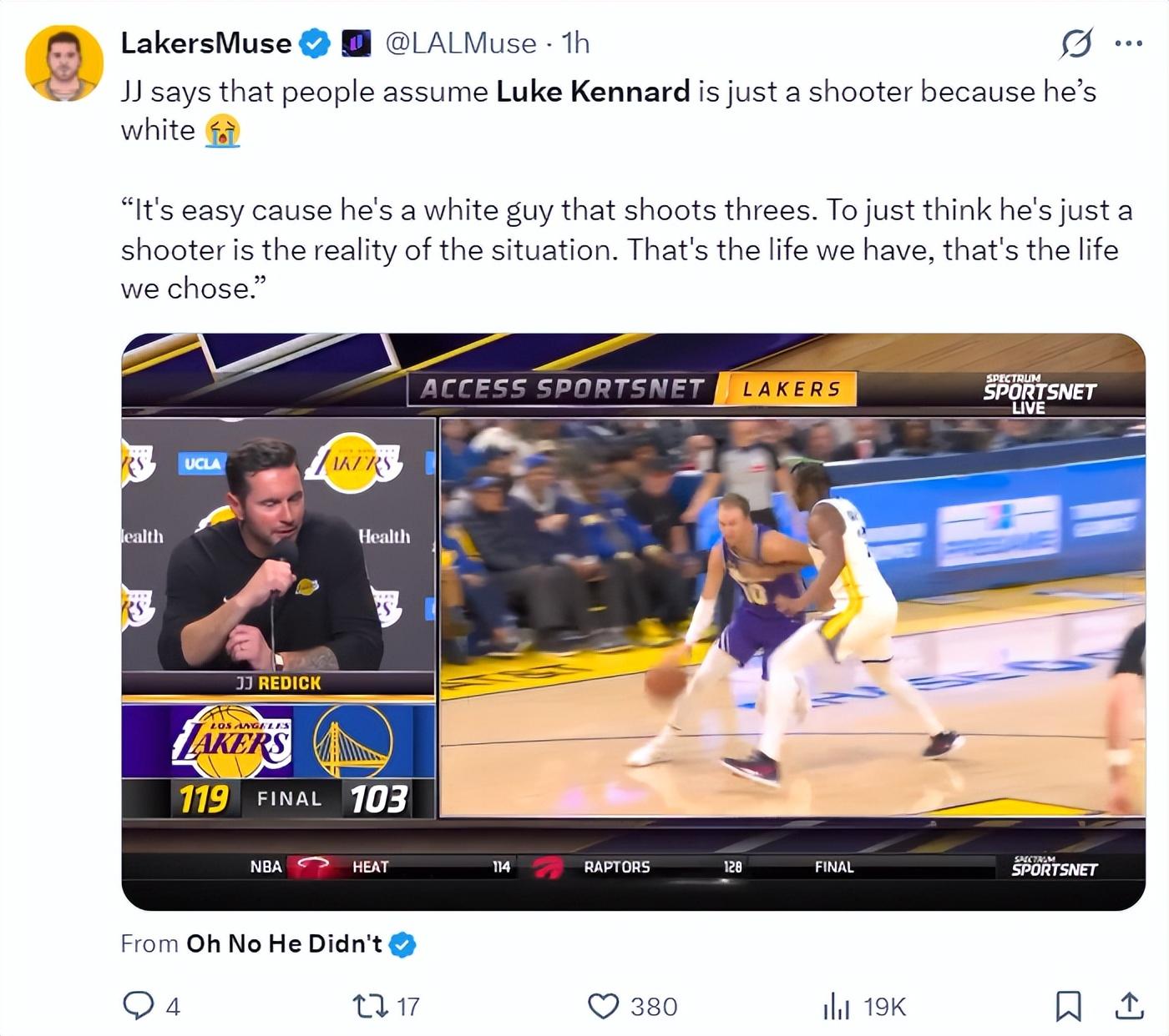 湖人以119-103大勝勇士結束三連敗,LAL重返西部第四的席位。這場比賽勒布朗、艾頓、布朗尼的發揮都不錯,但賽後雷迪克卻盛讚了盧克-肯納德。