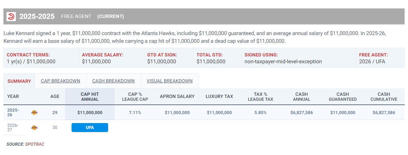 肯納德本賽季年薪爲1100萬,今夏他的合同就要到期,按照他目前的表現來看今夏湖人肯定會續約他,再拿一份千萬長約毫無問題。
