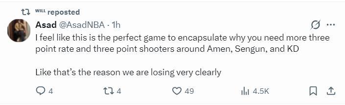休媒Asad寫道:我覺得這場比賽正好能說明爲什麼我們需要更多的投手來圍繞阿門、申京、杜蘭特等人,因爲我們正在遭受三分球太差帶來的損失。