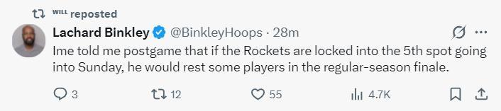 火箭隊記蘭德里-賓克利寫道:這場比賽之前烏度卡告訴我,一旦火箭只能排第五無緣升至第四,那麼火箭隊會在最後一場常規賽輪休全部的主力球員。