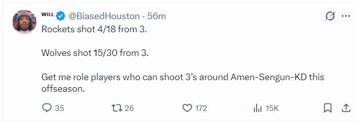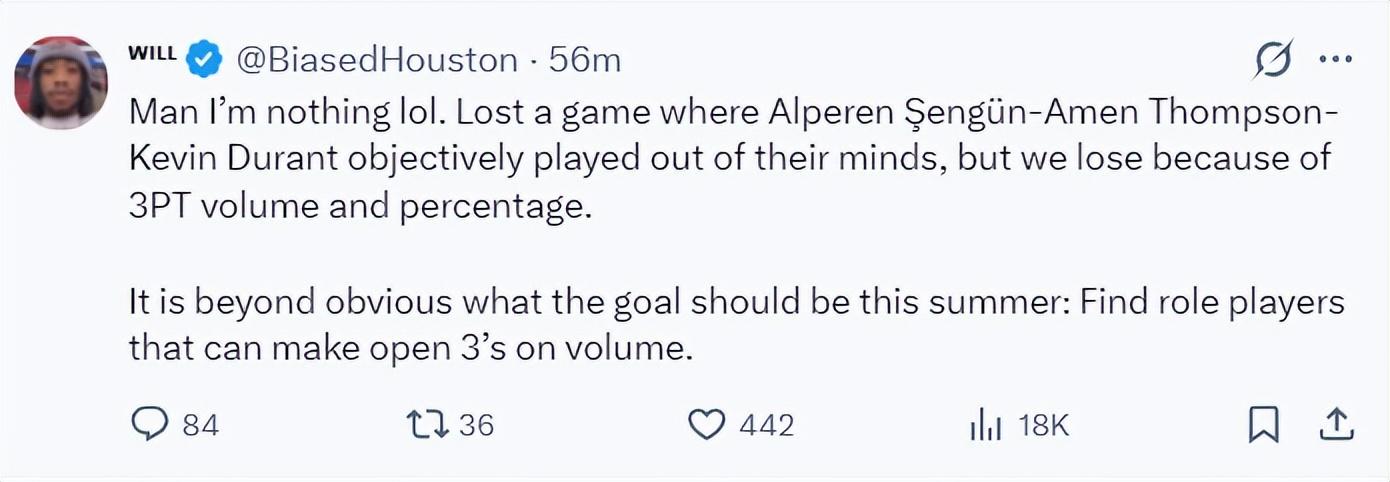 火箭記者Will寫道:森林狼全場三分30中15,而火箭三分球18中4,請在休賽期圍繞阿門、申京、杜蘭特補強能投進三分球的球員。(烏度卡也在賽後表示這場比賽失利的關鍵就是三分球無法命中)
